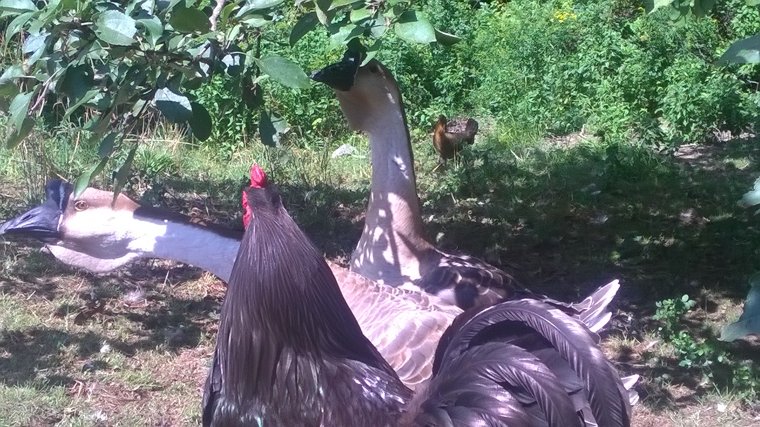 2 Giant African Geese – (We offer eggs from March to Sept). Their main purpose on the farm is for small predator protection of our chickens, but they also produce a delicious egg that has the taste and texture of a chicken egg but it’s about 4 times the size! Overhead predators are managed mainly from the rooster calls and making sure our pastures have plenty of tree and brush cover. We also raise our chickens close to our other livestock to help deter predators and also to take advantage of the symbiotic relationships. Chickens, geese and ducks help clean a pasture eating larve that thrive in manure and also bits of food left over from the larger animals.