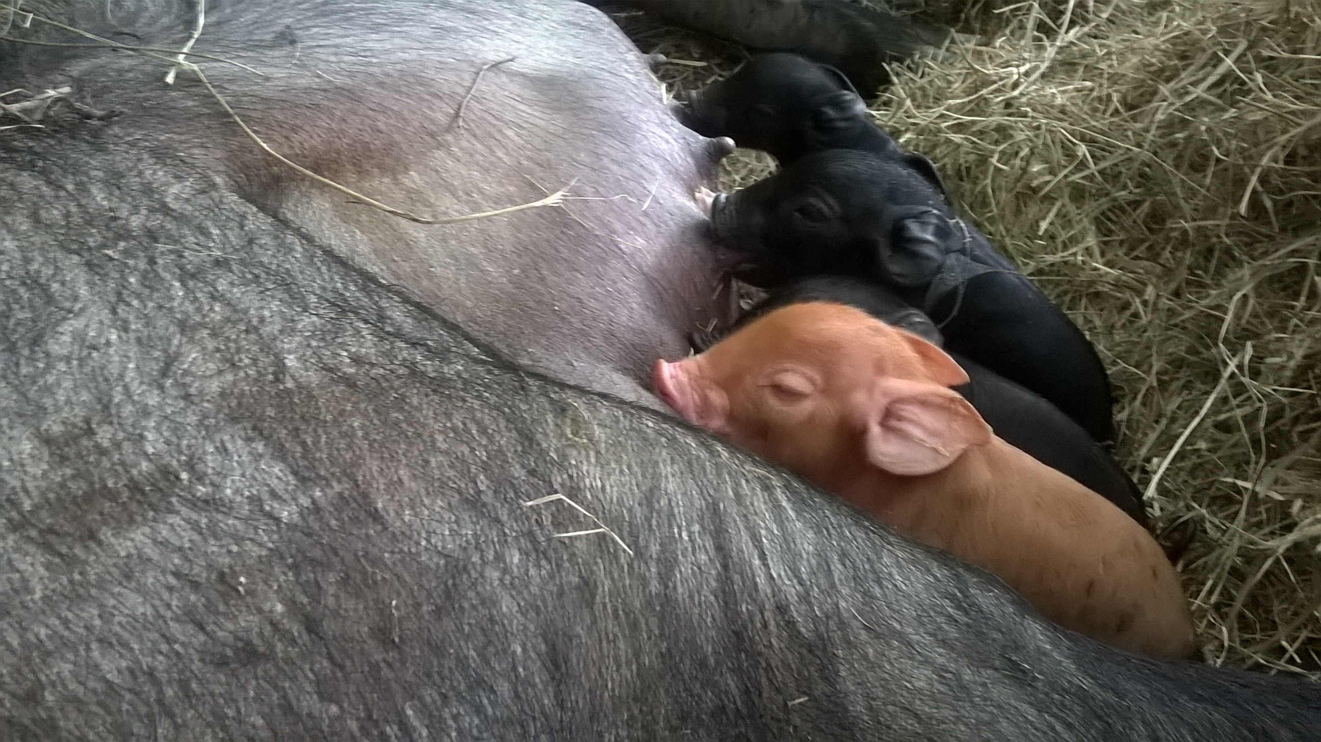 2 Big Black pigs (female who is breeding stock and a male also for breeding). Our pigs live in houses within a Woodlot Paddock. The pigs are moved regularly to fresh grass and forest, they also help plow up the gardens. We utilize Stratton Meats to slaughter on farm for our bulk customer orders, we use Hilltop in MA an organic butcher for retail pork. We now offer piglets in season (typically Spring) this year we have them available in the Fall too, they will be ready by late September. We can also provide roaster pigs, call or email for details.